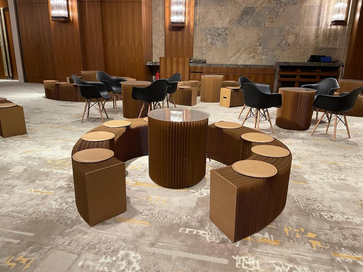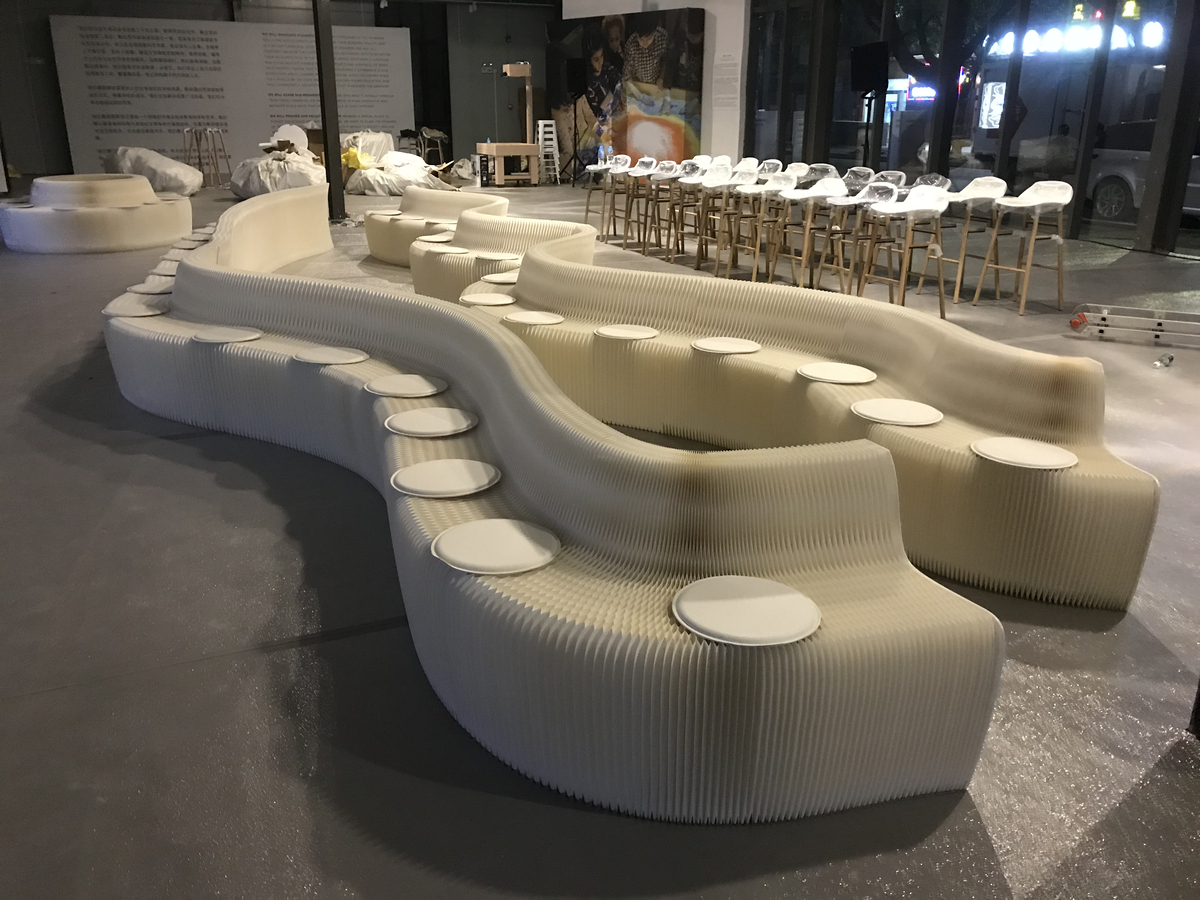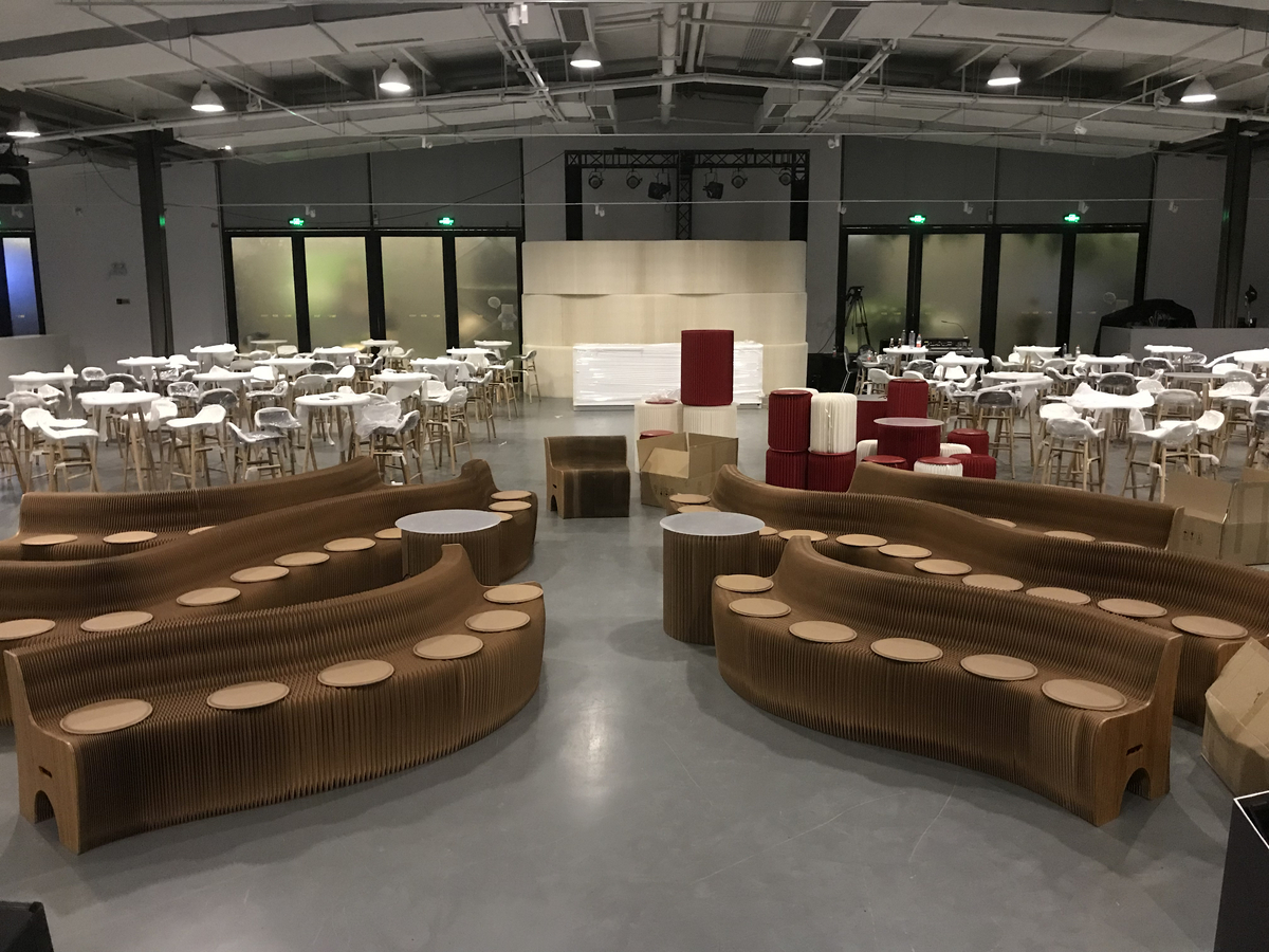 Regardless of traditional furniture rental, Eagle Focus still provide fantastic paper furniture rental&sale service for various event. Farewell to limitations, create possibilities, and constantly brings surprises to new life. Accordion paper furniture is a piece of furniture make of recycle kraft paper, unique honeycomb structure make it has strong bearing capacity up to 300 kg. Meanwhile, it can be extended and shaped freely, folded as a small book.